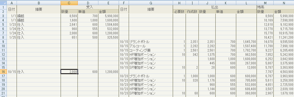 2をやるには製薬品・材料の数を製薬前に必ず確認しておかないと、あれ?元々何個あったか覚えてないから何回やったかわからんなった!みたいなことになって死にますので、私はいつも製薬前に帳簿上の値と倉庫をにらめっこしながら数を全て確認し、その後製薬をやっていました。