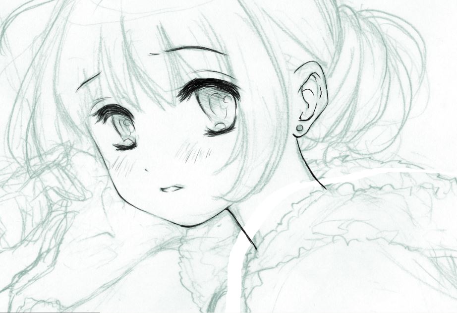 絵柄自体は今回サックリ描こうとだけ決めていて、いつもの自分の癖が良く出た絵柄にはならないよう、瞳と顔ラインだけ注意して描き進めました。それと線の整え方を、線の重さ太さで強弱出していたものを線の重ね具合で調整して、線自体強く出しゃばらないに気を付けました(気を付けるだけ)。気持ちいつもより繊細になったようなそうでないような。