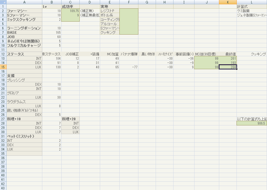 左側が在庫表、右側は実際の製薬時作成できそうな数を主要アイテムから概算する表です。