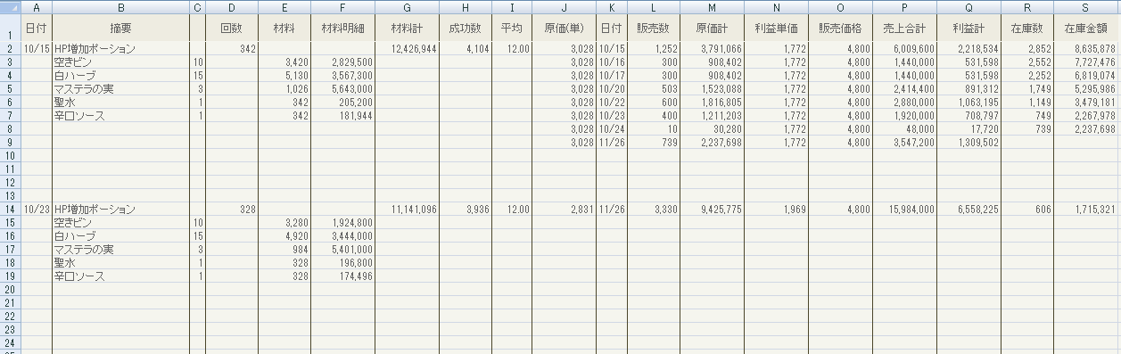 2をやるには製薬品・材料の数を製薬前に必ず確認しておかないと、あれ?元々何個あったか覚えてないから何回やったかわからんなった!みたいなことになって死にますので、私はいつも製薬前に帳簿上の値と倉庫をにらめっこしながら数を全て確認し、その後製薬をやっていました。