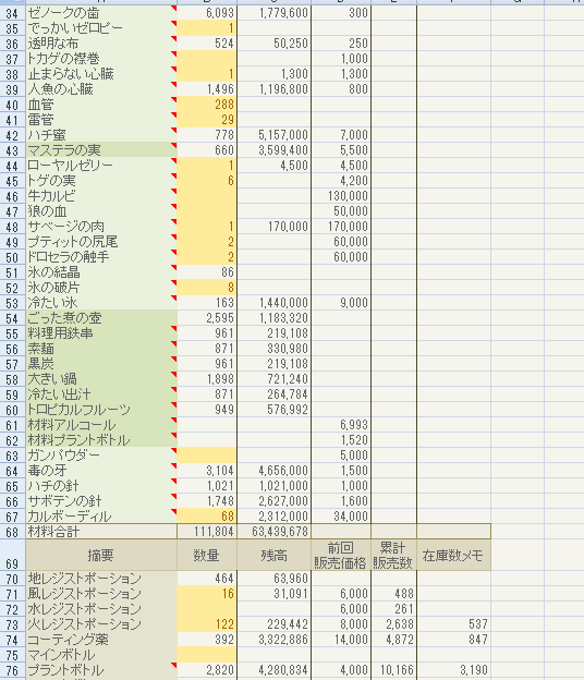 製薬時間には帳簿と睨めっこする時間を含んでいません。毎日は付けませんが、仕入れた材料を確認し記して他アカウントから移動させ……という作業にも結構時間を食いますし、製薬後の製薬数を付けたりなんだかんだで更に1時間2時間が過ぎて行きます。在庫の引き出しを全部VBAで出力してもそんなです。
