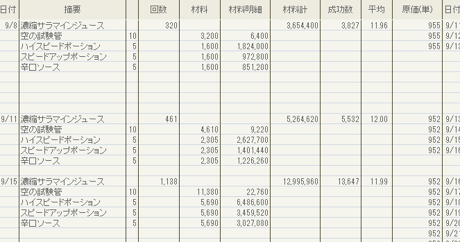 上記から、具体的な数値を出さなくとも濃縮サラマインジュースに関しては瑞谷環境の原価が予想できると思いますが、現状平均成功数は11.9個以上(ミスなどで想定値よりも低い回があり正確には出せない)です。